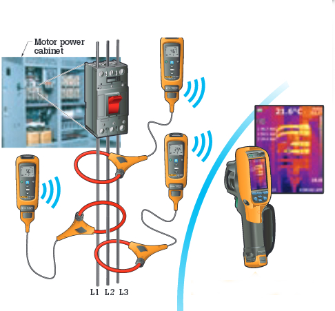 Start with a thermal imager, like the Fluke Ti100, Fluke Ti105, Fluke Ti110, or Fluke Ti125 and then add a few CNX enabled electrical meters with AC transducers attached and get them all turned on and on target. The data from the transducers will transmit wirelessly and allow the electrical data to be displayed onscreen with your thermogram (see the diagram at right). After you take all your images and readings you can wirelessly upload them to a computer equipped with CNX software and analyze them to create reports on your findings.